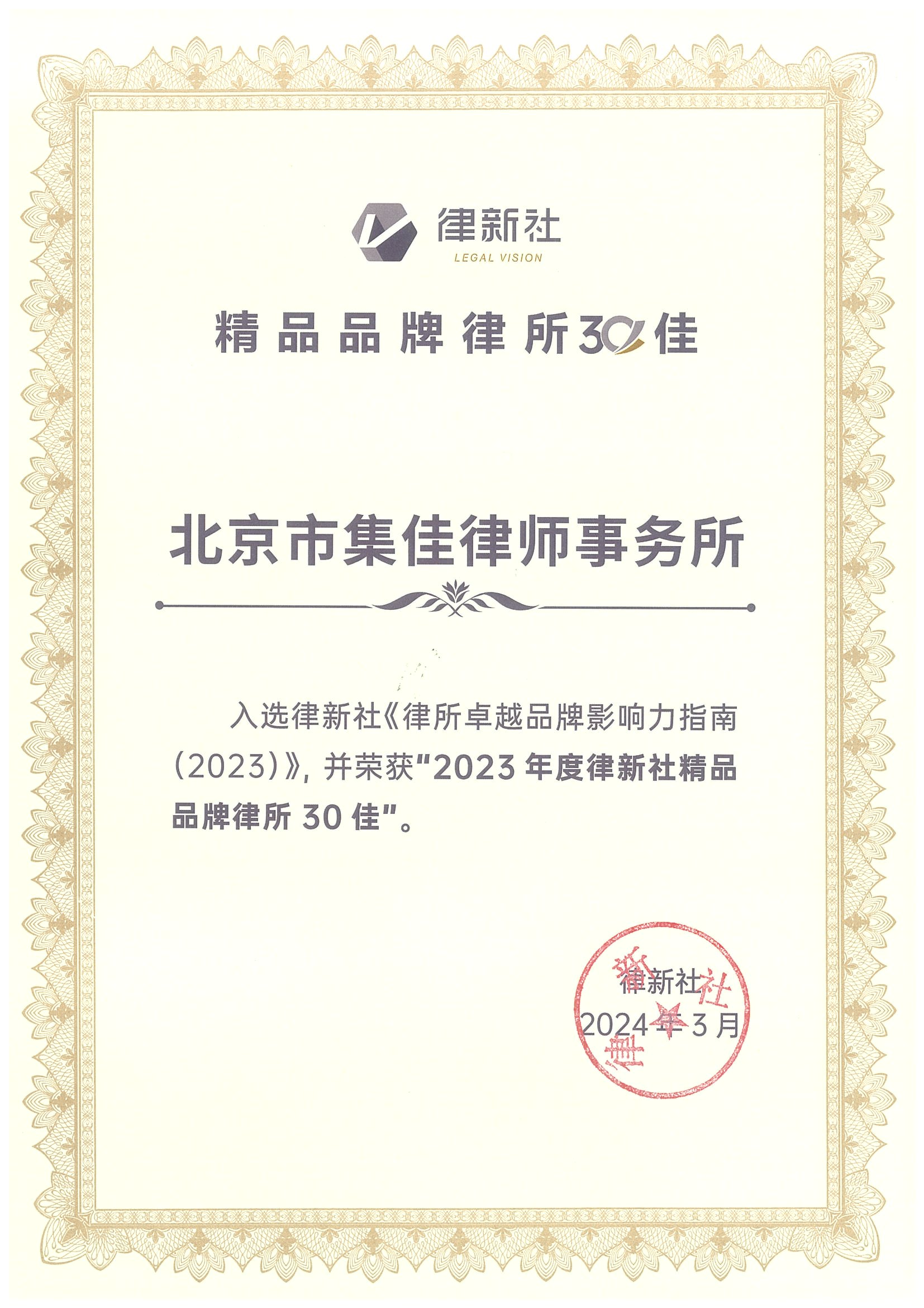 >壹号娱乐>关于我们>荣誉概览>2024>壹号娱乐入选 “2023年度律新社精品品牌律所30佳”
