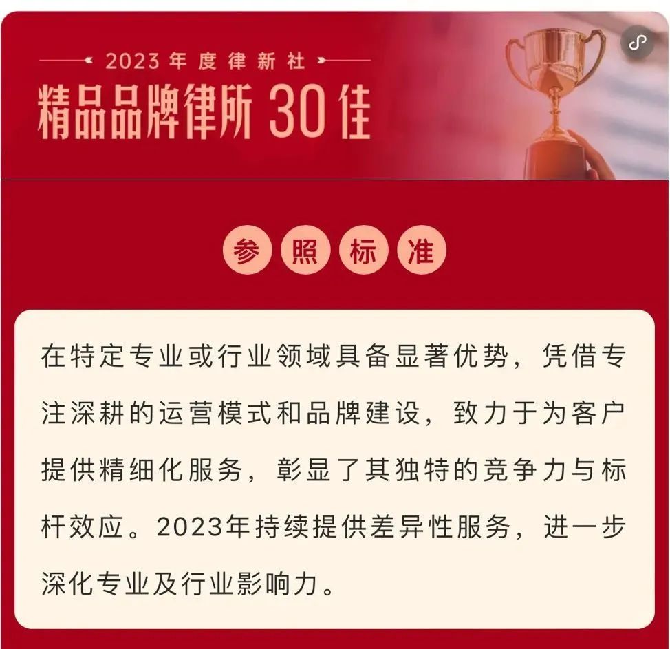 壹号娱乐入选 “2023年度律新社精品品牌律所30佳”