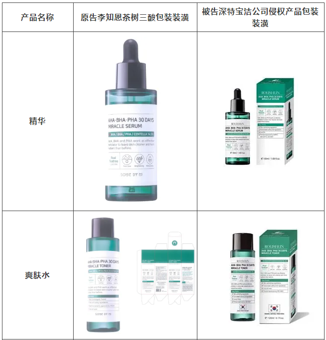 2021年原告委托壹号娱乐调查发现,被告汕头市深特宝洁实业有限公司生产、销售和推广的“茶树祛痘美白补水液”“茶树香皂”等护肤品,其产品包装装潢直接抄袭、摹仿原告前述已经具有较高知名度和影响力的“SOME BY MI/莎柏蜜”茶树三酸系列化妆品和黑蜗牛精华液的包装、装潢设计,使用与之近似的标识,造成消费者混淆误认。故原告作为茶树三酸、黑蜗牛精华包装装潢权益获益人,诉至广东省汕头市中级人民法院。汕头中院认定:李知恩主张的茶树三酸、黑蜗牛精华包装装潢构成具有一定影响的包装装潢,深特宝洁公司生产、销售茶树三酸、黑蜗牛精华液的行为构成不正当竞争。因判赔额不符合原告预期,原告后上诉至广东省高级人民法院,广东省高级人民法院最终维持一审判决。