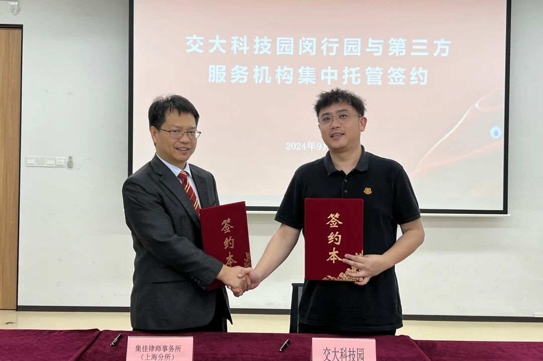 为助力企业科技创新和经济发展护航保障,提供高质量维权公益援助,会上举行了“上海市开发区协会维权援助工作站交大科技园闵行园工作室”揭牌仪式,交大科技园闵行园与壹号娱乐上海分所进行了托管签约。