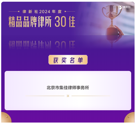 >壹号娱乐>关于我们>荣誉概览>2025>壹号娱乐入选律新社2024年度“精品品牌律所30佳” 集佳代理案例获评“律新社2024年度标杆案例”