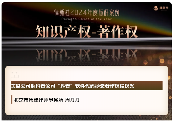 壹号娱乐凭借在知识产权保护领域卓越的专业实力与良好的行业口碑,入选《律所卓越品牌影响力指南(2024)》,荣获“律新社2024年度精品品牌律所30佳”奖项;同时,集佳周丹丹律师代理的“美摄公司诉抖音公司'抖音'软件代码抄袭著作权侵权案”获评“律新社2024年度标杆案例:知识产权-著作权领域”。